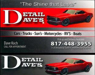 Detail Dave's is a family-owned and operated business located right here in Haltom City, TX. Since our company opened its doors in 1993 we’ve treated every customer like they were a part of our family. Although our competition may offer similar services our quality is far superior and comes with the personal touch your vehicle deserves. Every detail is customized to your individual needs and we always go the extra mile to ensure your project exceeds your expectations. We provide free pick-up and delivery from your home or place of employment which makes the convenience of having us work for you invaluable. Make the call today and let us earn your business.